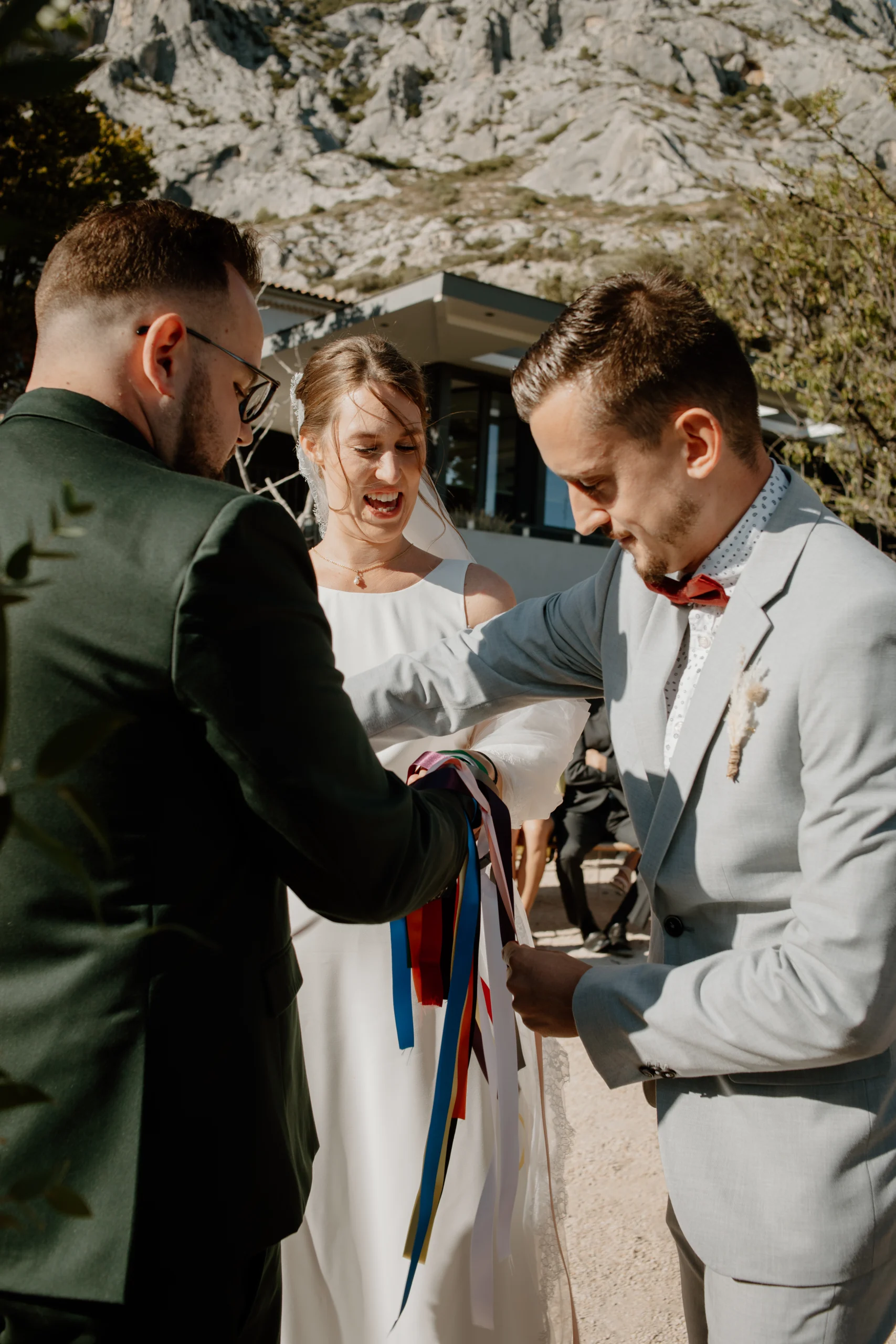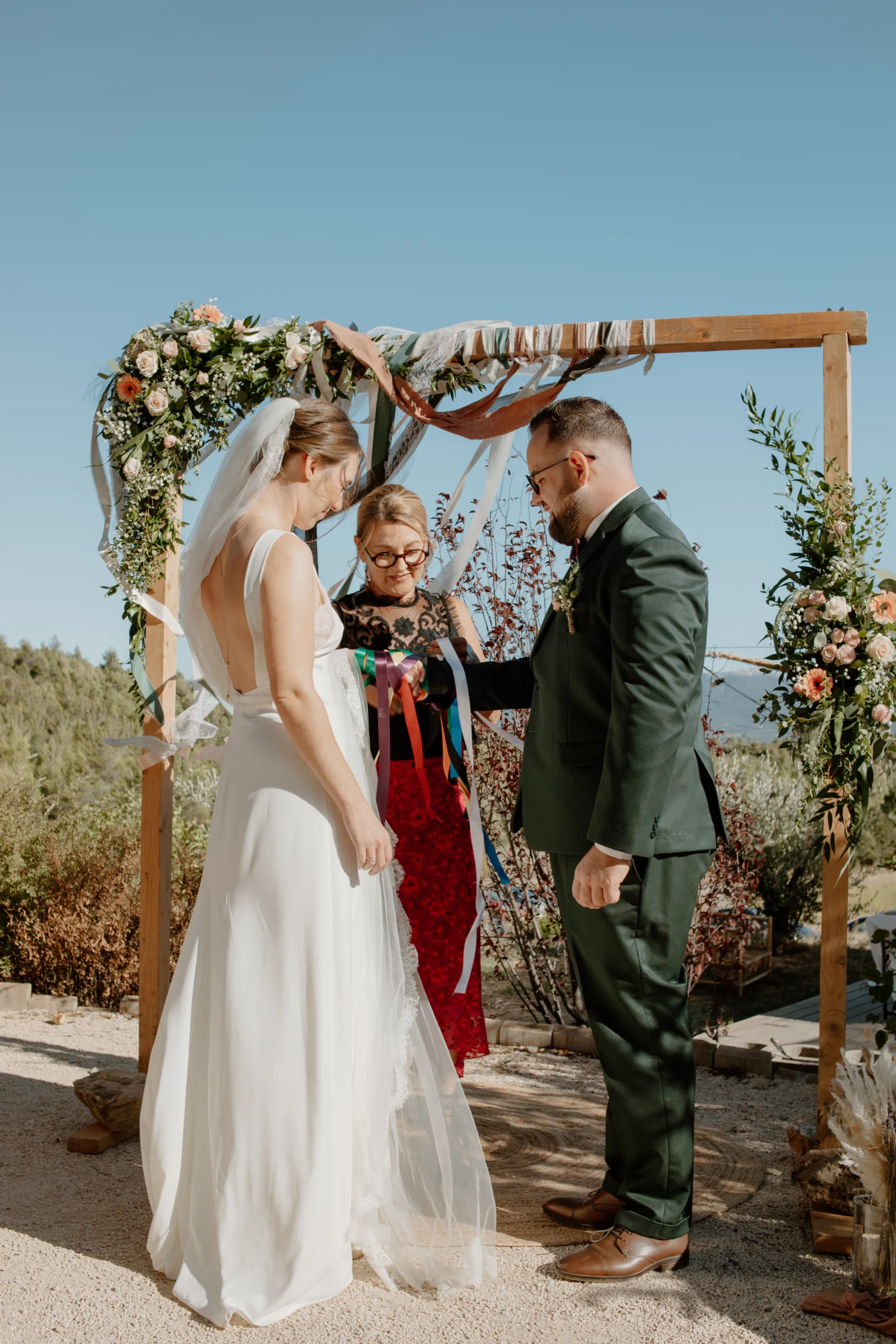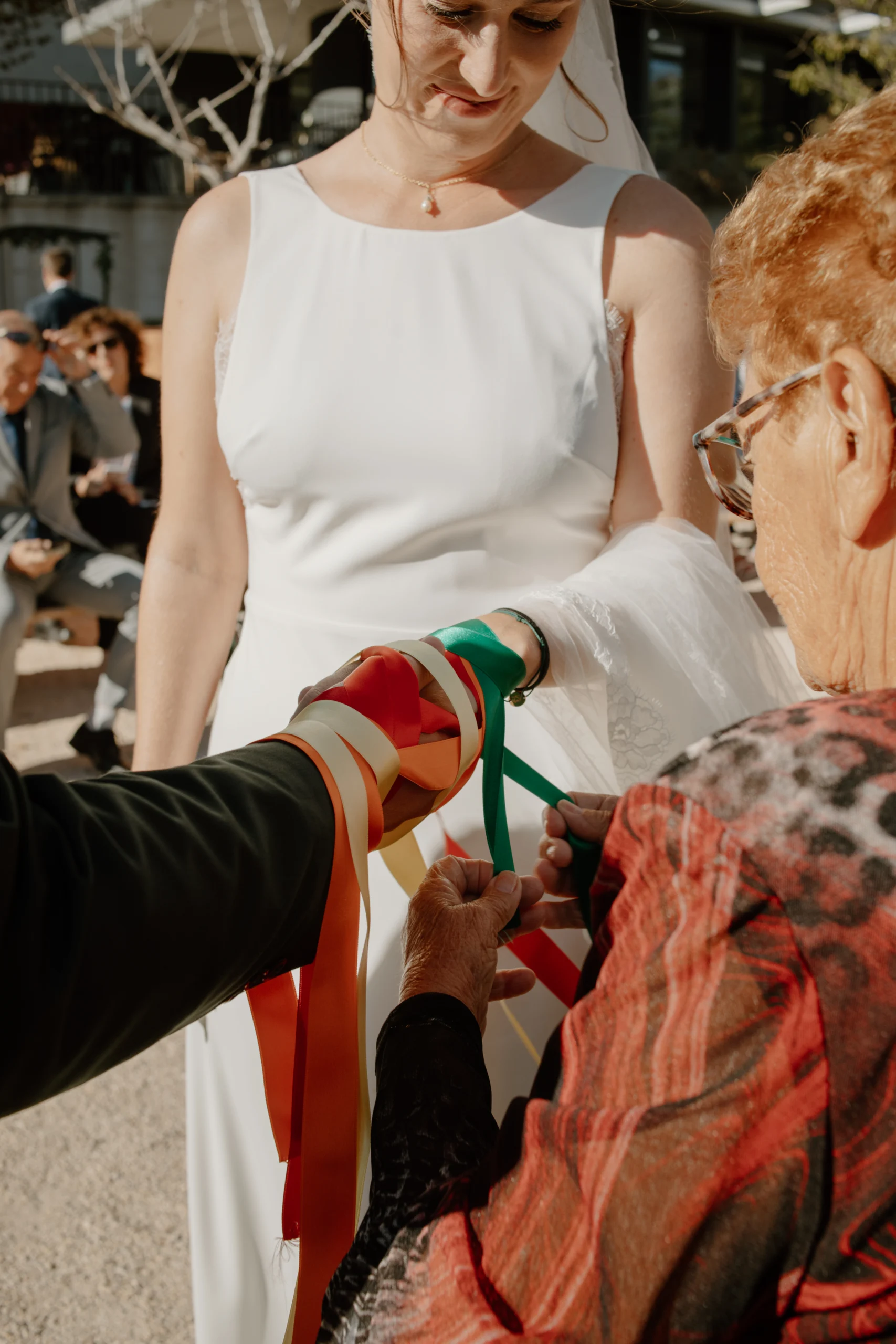 L’un des moments forts de la cérémonie fut le rituel des rubans. Inspirée d’une ancienne tradition celtique, cette symbolique consiste à nouer autour des mains des mariés des rubans colorés, chacun représentant une valeur ou un engagement :