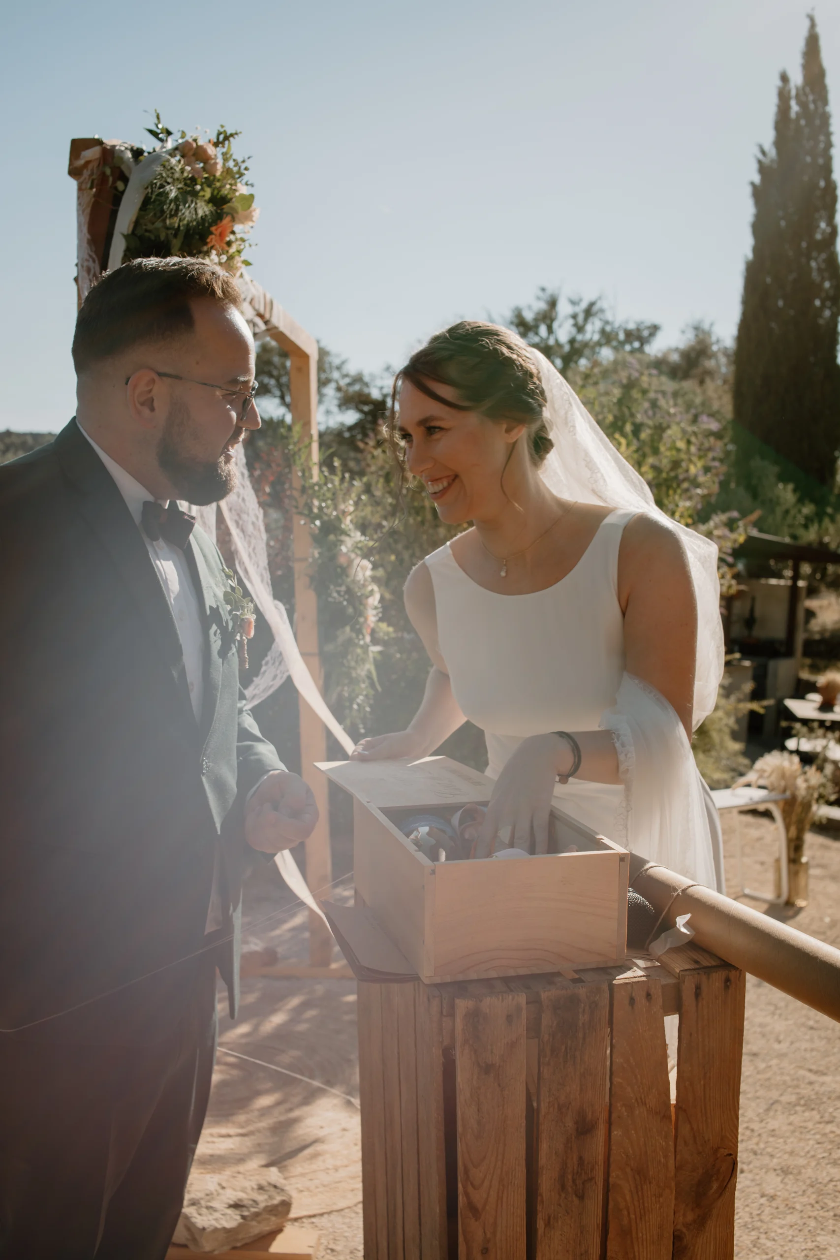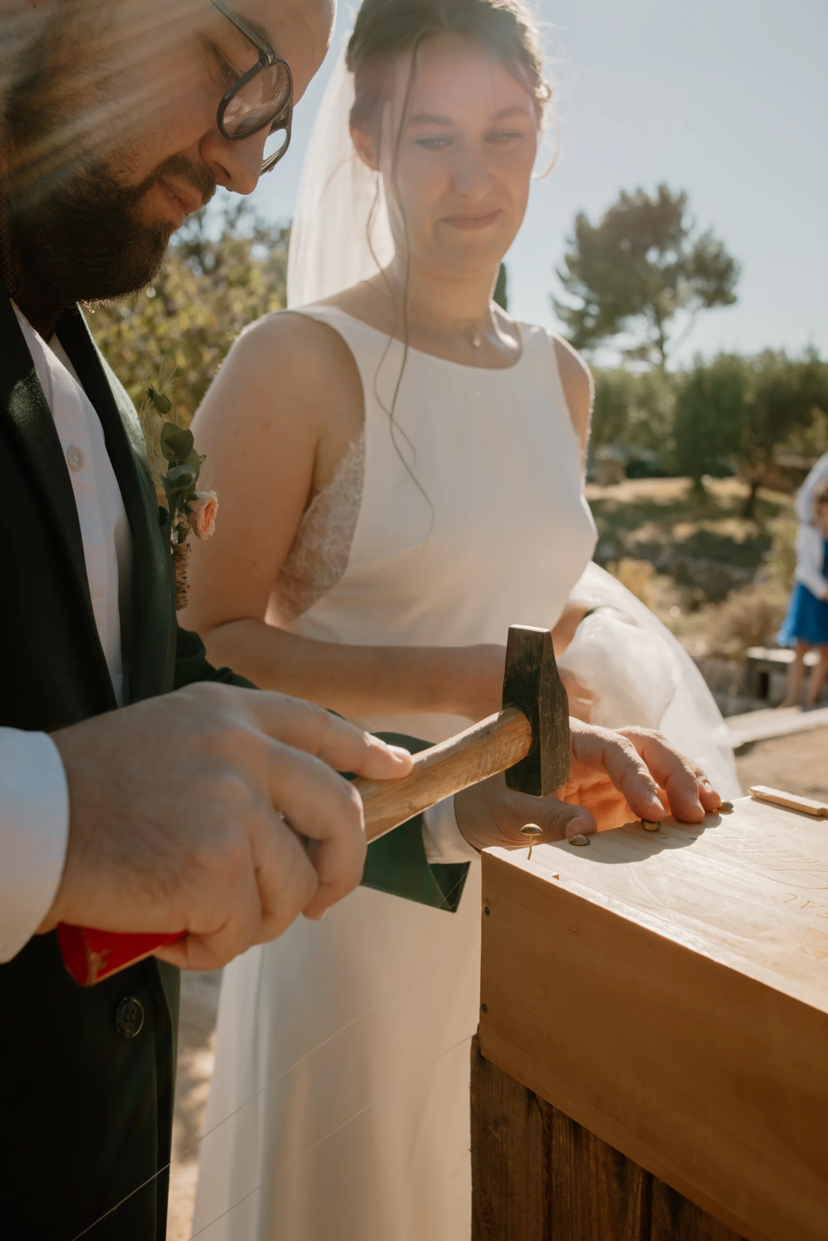Le deuxième rituel choisi par les mariés fut celui de la boîte scellée. Chacun avait écrit une lettre à l’autre, contenant ses sentiments, ses promesses, et ses rêves pour leur avenir commun. Ces lettres ont été placées dans une boîte en bois, accompagnées d’une bouteille de vin.